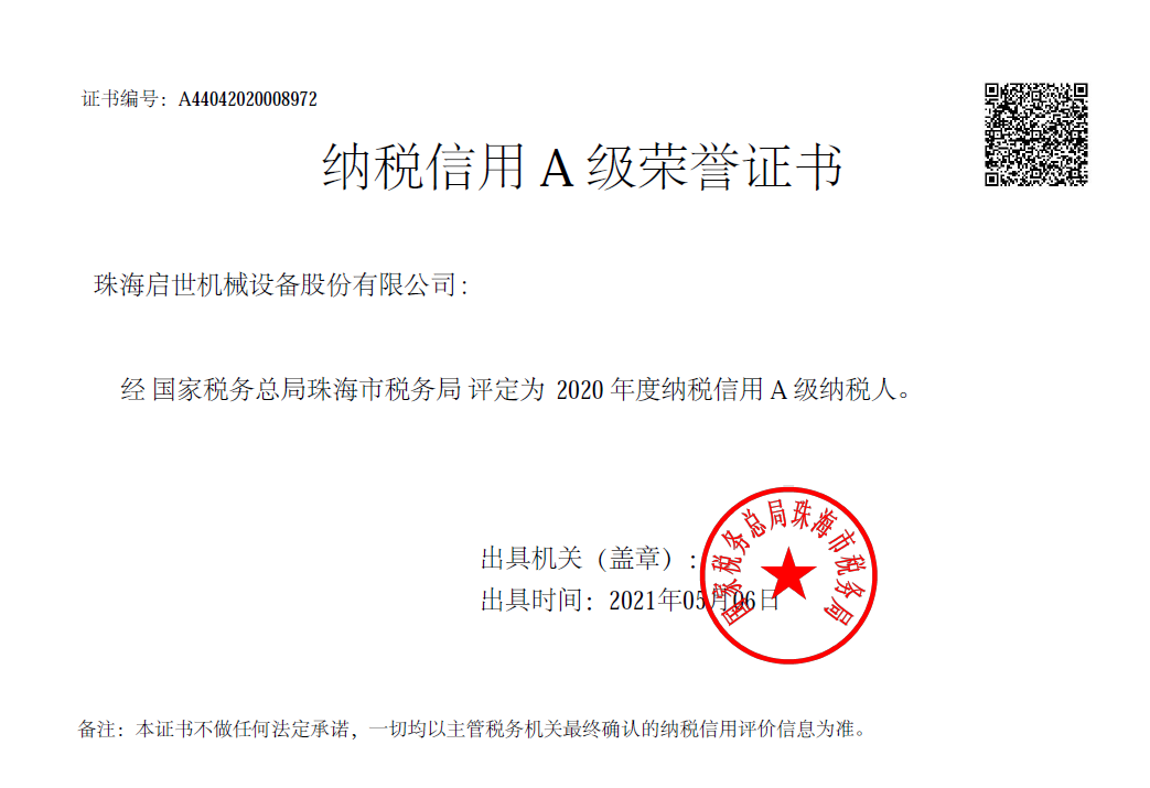 納稅信用A級榮譽證書