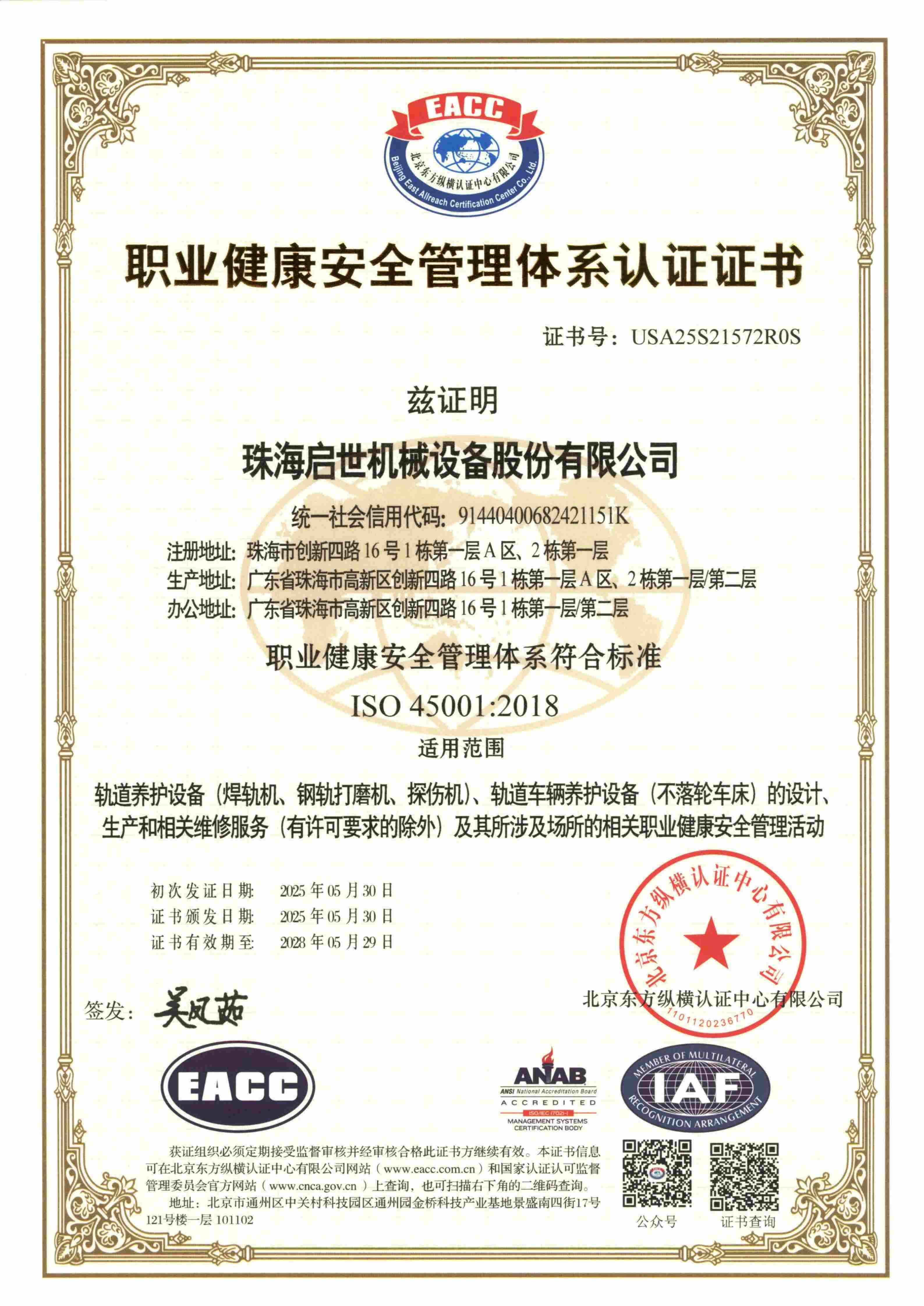 職業健康安全管理體系證書